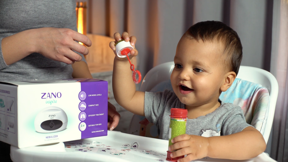 - Положение на бебето: Дръжте бебето в изправена позиция или леко наклонено назад, за да улесните дишането и доброто проникване на аерозола.